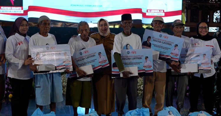Presiden Prabowo Subianto melalui Yayasan Gerakan Solidaritas Nasional (GSN) menyalurkan 530 becak listrik untuk para pebecak di Ponorogo, Senin (9/2).